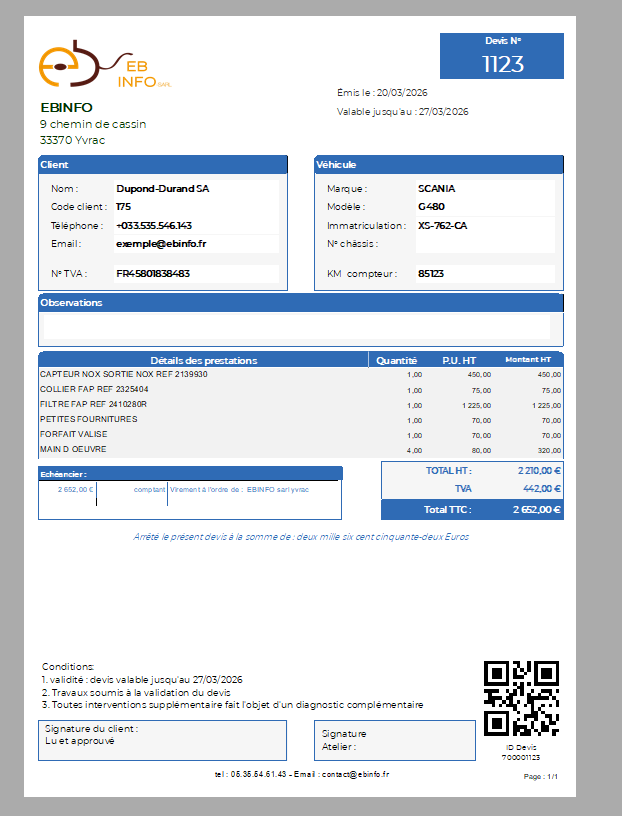 AtelixIQ permet de transformer naturellement l'intervention atelier en devis clair, structuré et exploitable commercialement, tout en conservant les informations du véhicule et du client.